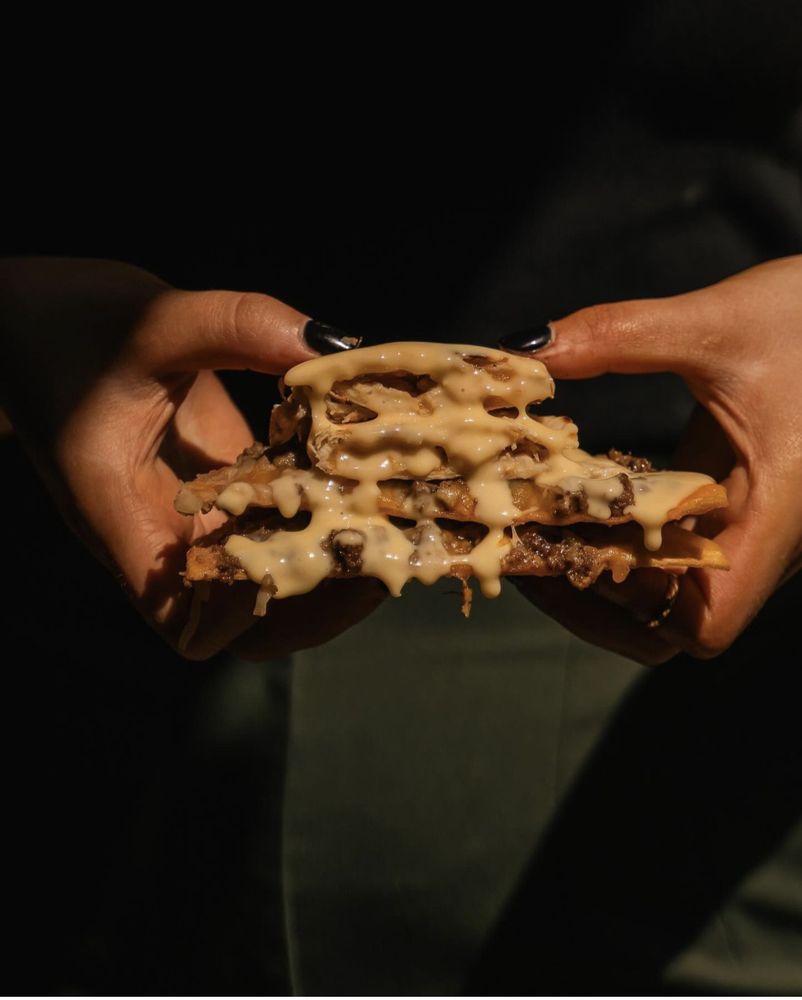 Flour tortilla filled with mix cheese, sour cream, pico de gallo and guacamole